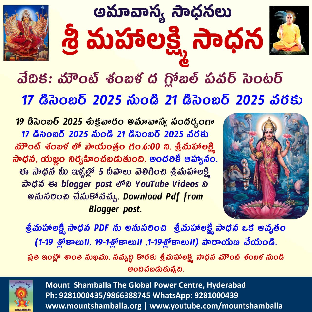 Sri Mahalakshmi Sadhana is offered from Mount Shambala for peace, happiness and prosperity in every home.