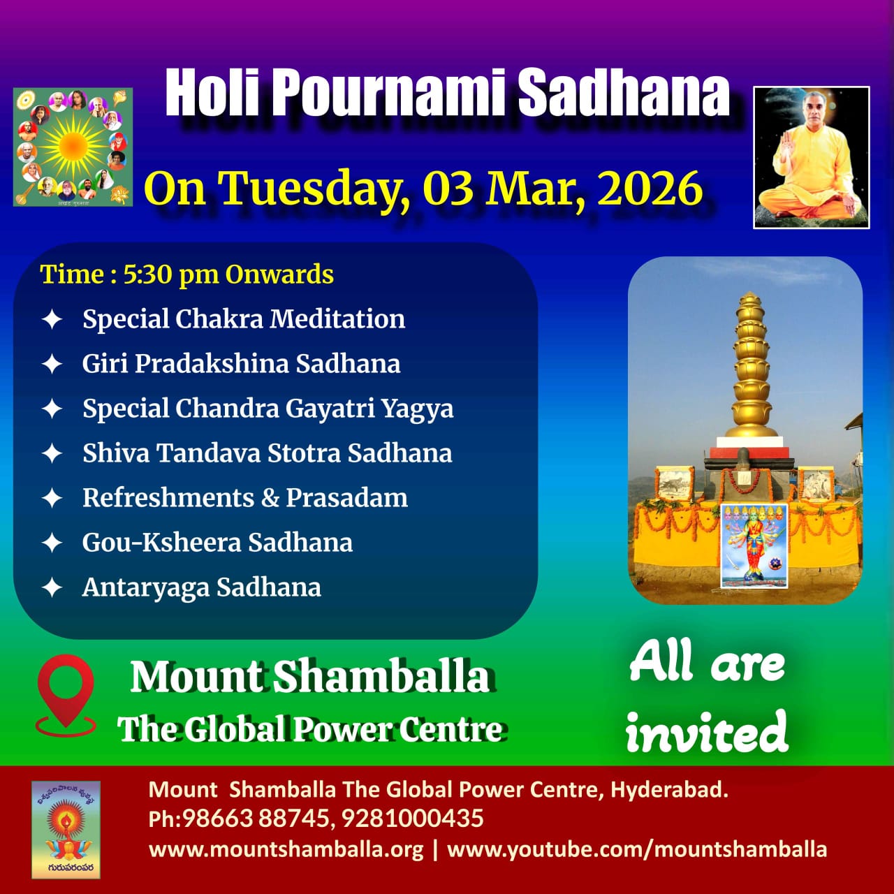 Note: On 2 March Holi Fire Ritual, On 3 March Pournami Sadhana