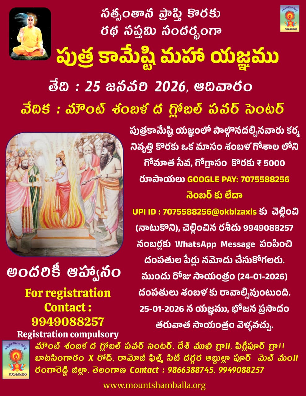 Those who wish to participate in the Putrakameshti Yajna should serve the cow mother in the Shambala cowshed for one month and pay ₹5000 for cow food to atone for their karma.